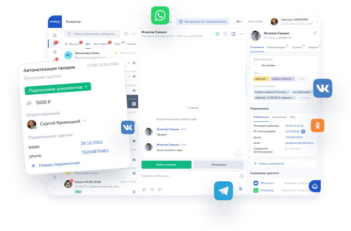 Диалоги из всех мессенджеров в едином окне. Работайте с карточками клиентов и отправляйте вложения.